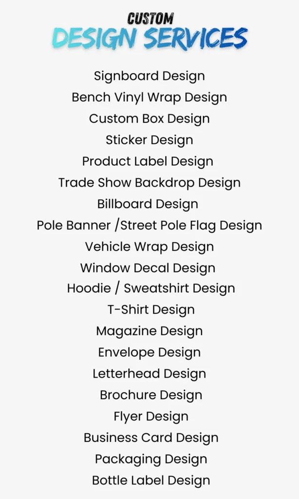 Flyers, business cards, menus, signage, billboards, vehicle wraps, T-shirts, product packaging and more. .